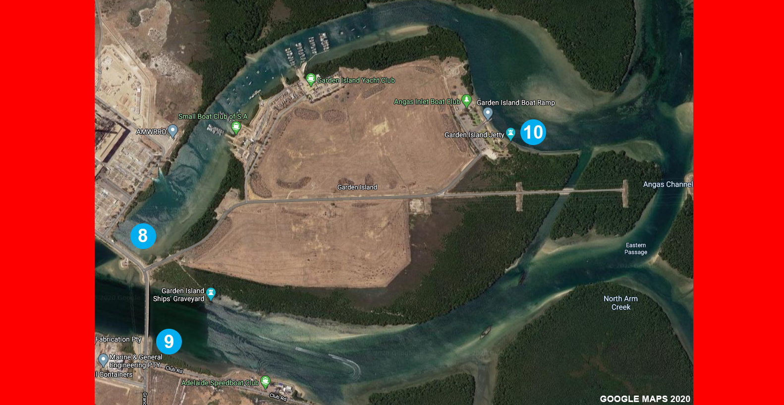 The Red Section includes the Torrens Island Hot Water Outlet (Spot 8) which pumps out hot water into the river and it can fire up the fishing, particularly in the cooler months. The current races at Spot 9 which is ideal for Salmon Trout and the occasional Kingfish. Both spots 8 and 9 are rocky terrain. Spot 10 is the Garden Island Jetty which is easy to access for all.